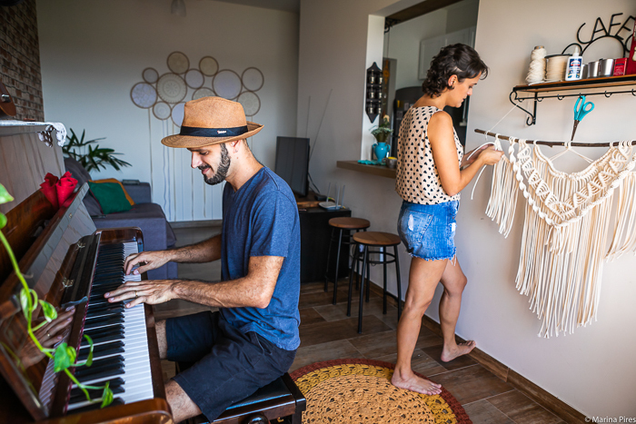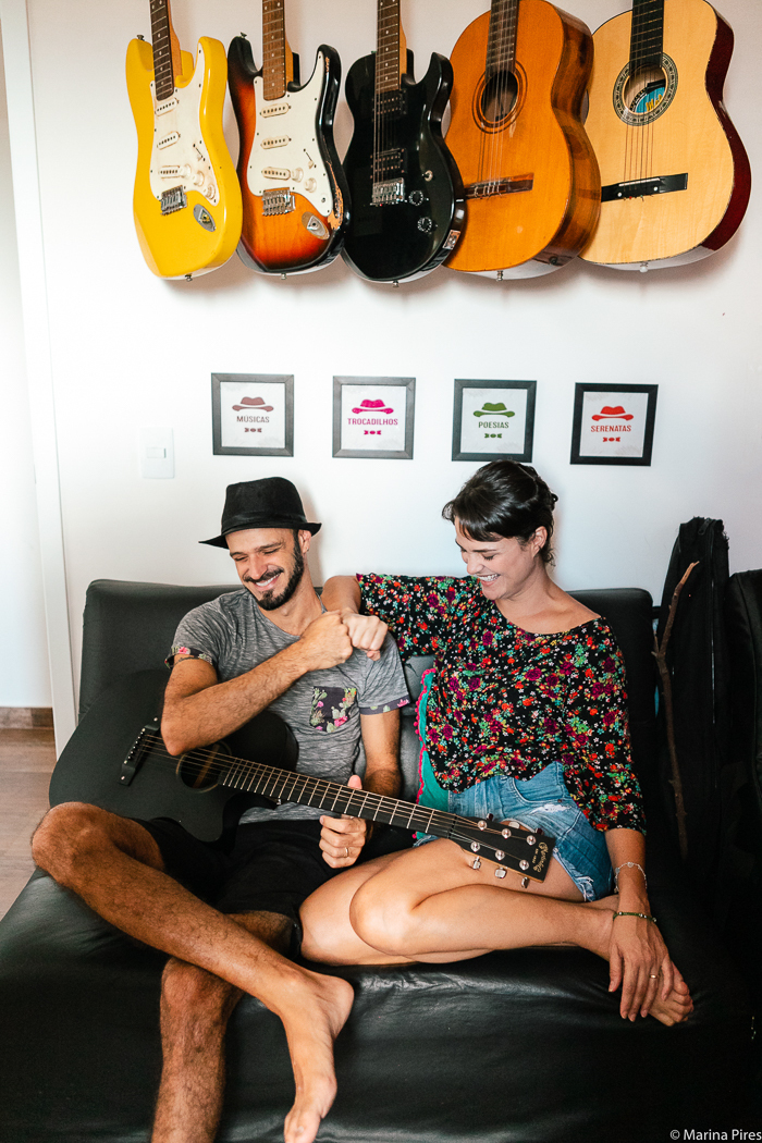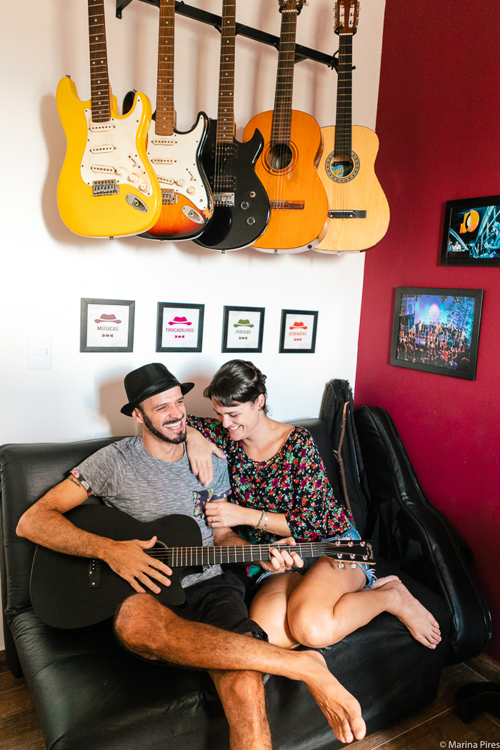 Rafa e Amanda são pura arte. Cada canto na casa deles nos conta isso. O macramê que ela fez para o casamento deles e está pendurado na parede da sala, o tapete colorido de crochê, tb feito por ela. Instrumentos musicais pela casa inteira: